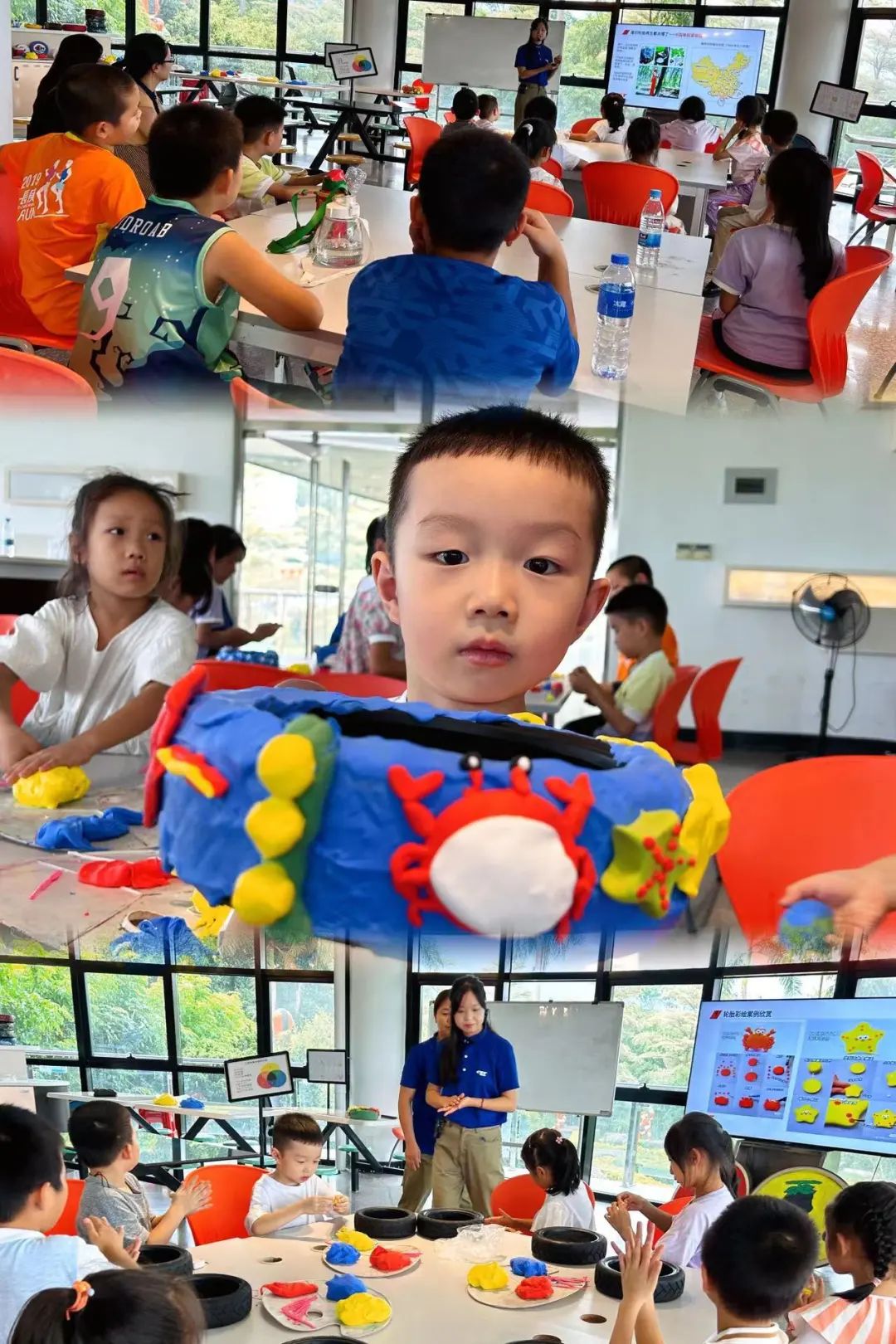 接下来,在正新集团工作人员的介绍和带领下,小营员们进行了废旧轮胎黏粘土DIY学习:学习三原色调色原理,考验孩子们的动手能力和创新意识,创作属于自己独一无二的废弃小轮胎,还可带回家进行二次创作。